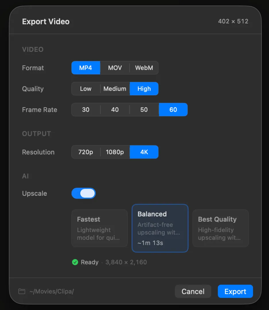 Clipa Studio is a macOS-native screen recording and editing app that bakes AI upscaling directly into the export step. No separate upscaling app, no intermediate render, and no need to leave the editor just to improve resolution.
