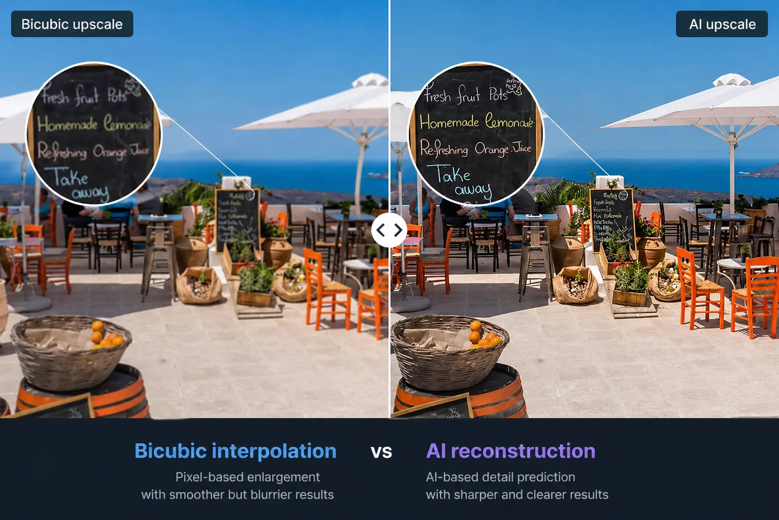 | Aspect | Traditional (bicubic) | AI upscale |